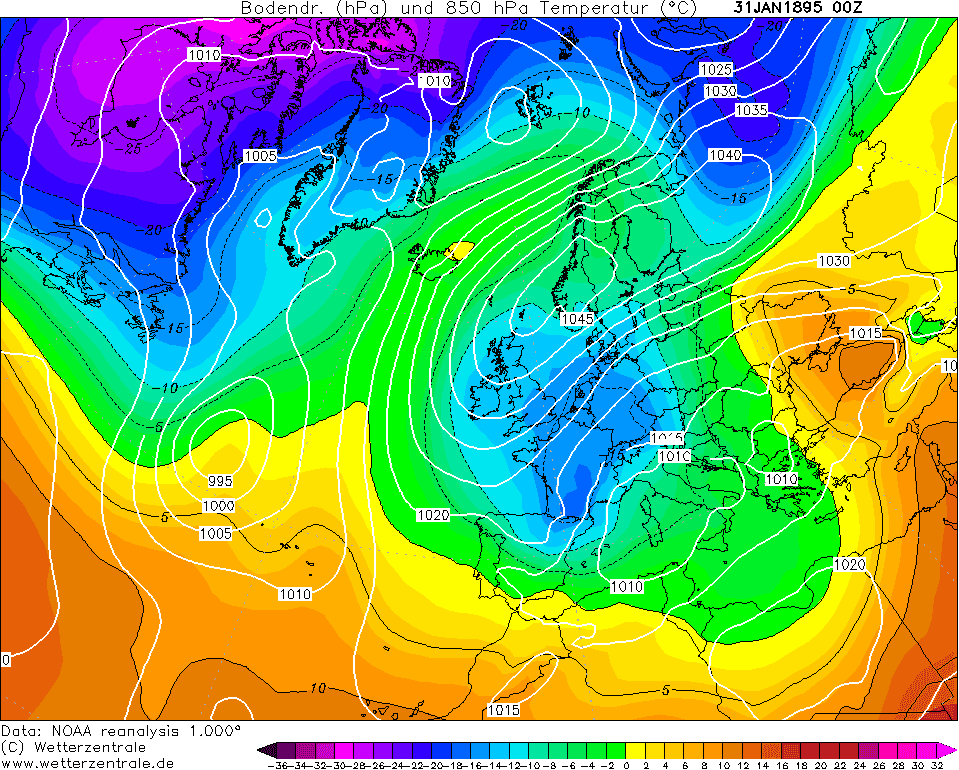 Carte NOAA de la température à 850 hPa, en date du 31 janvier 1895