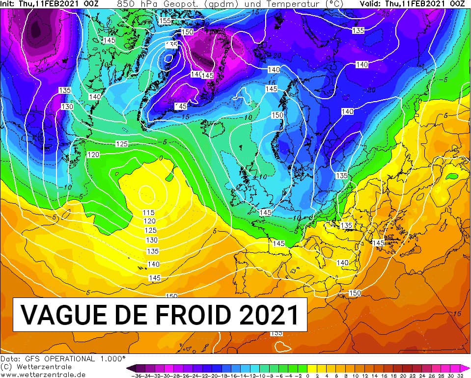 Températures 850 hPa par le modèle GFS, en date du 11 février 2021