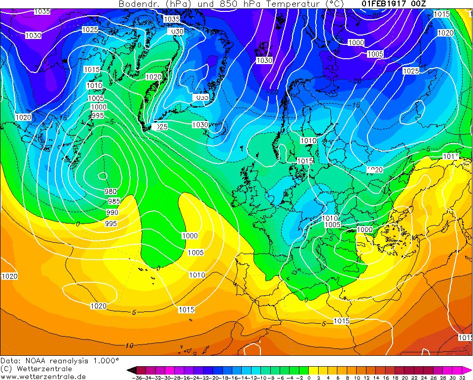 Carte NOAA de la température à 850 hPa, en date du 1er février 1917