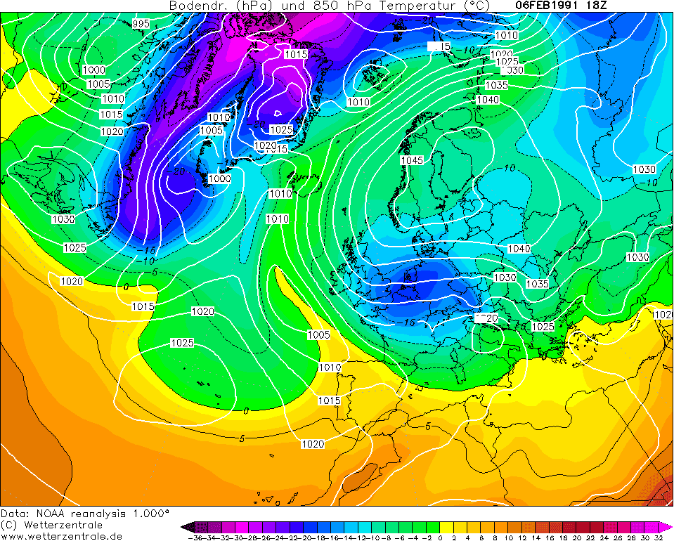 Carte NOAA de la température à 850 hPa, en date du 6 février 1991