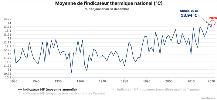 Cette année 2020 pourrait être l'année de tous les records en terme de température sur le territoire national. En effet, les températures ont été régulièrement au dessus des normales, avec un hiver particulièrement doux (le + doux jamais observé >>), et un été marqué par une forte canicule au mois d'août (>>).