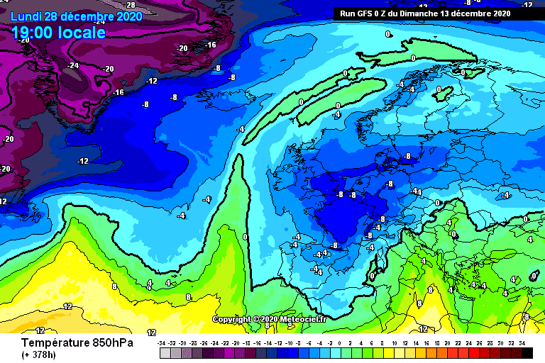 Température de la masse d'air à 1500m d'altitude - modélisation pour le 28 décembre (sortie GFS du 13 décembre minuit) - Météociel