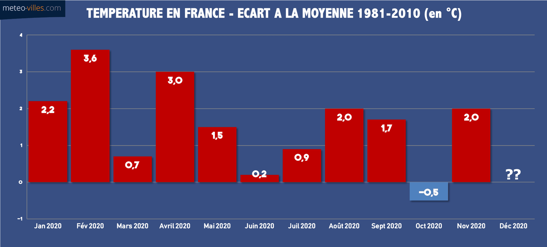 Température en France - écart mensuel à la moyenne 1981-2010 - Météo-Villes