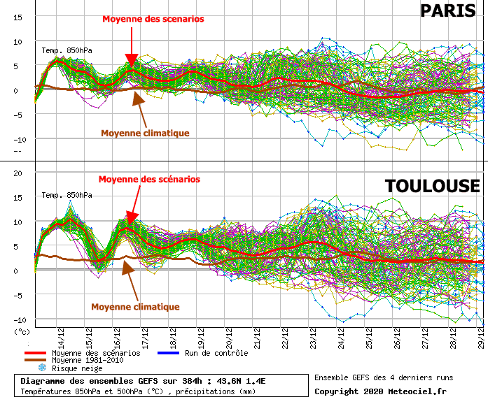 Prenons l'exemple de deux villes (Paris et Toulouse), mais cette fois sur le modèle ensembliste américain GEFS. Cette tendance au dessus des moyennes de saison apparait également de façon largement majoritaire jusqu'au 20 décembre. Passé cette date, les scénarios commencent à diverger avec des sorties froides comme des sorties très douces, ne permettant pas de faire ressortir une tendance fiable.
