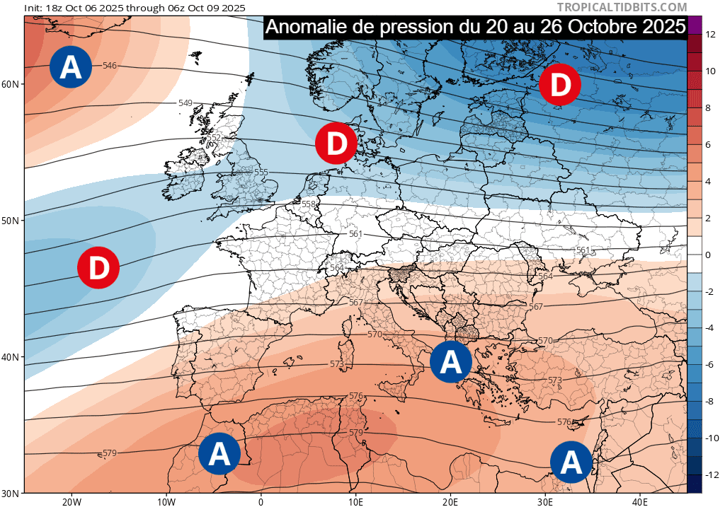 La carte de l'anomalie de pression pour la semaine du lundi 20 au dimanche 26 octobre 2025 semble aller dans ce sens. L'anticyclone pourrait migrer en direction des hautes latitudes (vers le Groenland), ce qui permettrait à un contexte plus dépressionnaire de se dessiner du proche-Atlantique vers la Scandinavie. Le flux dominant pourrait donc redevenir océanique et dépressionnaire, favorisant le retour des perturbations. Ces dernières pourraient être plus actives au nord tandis que la Méditerranée pourrait y échapper, en marge de hautes pressions sur le bassin.
