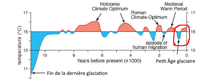 On parle souvent du minimum médiéval comme d'un "petit âge glaciaire". En effet, les températures mondiales ont baissé au cours du Moyen-Âge, dès le début des années 1300. Le véritable réchauffement ne sera observé qu'au milieu du XIXème siècle. Cependant, cette période de l'histoire récente n'a absolument rien à voir avec une glaciation. On remarque sur le graphique ci-dessous que les températures n'ont baissé que d'environ 1°C dans le monde, très loin des 7 à 9°C de baisse causés par les véritables âges glaciaires !