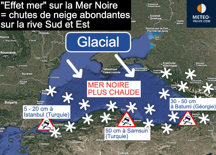 Notons que ce phénomène est appelé "effet de lac" car il est particulièrement réputé dans la région des Grands Lacs dans le nord de l'Amérique, où les épisodes peuvent parfois apporter 1 à 2 mètres de neige. Cependant, le phénomène est observé dans différentes régions du monde où la géographie le permet. Ici, il faudrait plutôt parler d'effet de mer pour l'influence de la Mer Noire.