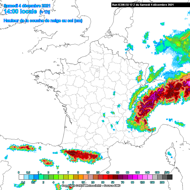 Animation de la couche de neige sur la France jusqu'au jeudi 9 décembre 2021 - Modèle ICON via meteociel.fr