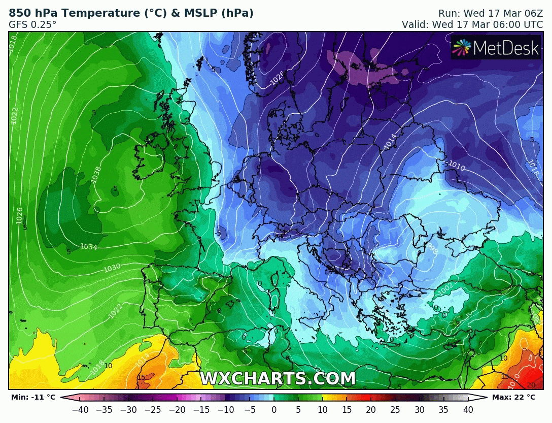 Animation de la masse d'air du mercredi 17 au mardi 23 mars 2021 - via wxcharts.com