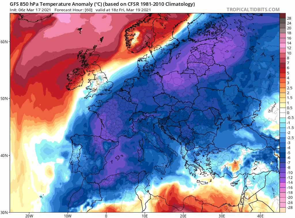 Anomalies thermiques de la masse d'air du samedi 20 au jeudi 25 mars 2021 - via tropicaltidbits.com
