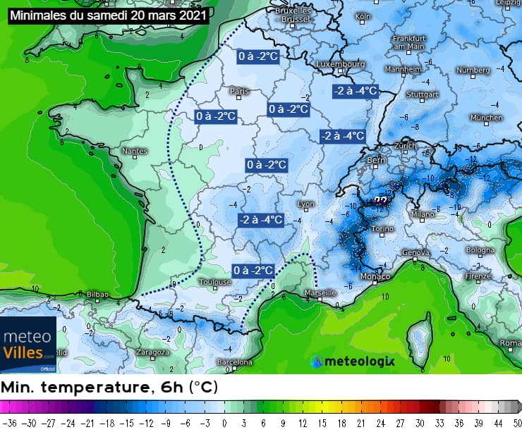 Modélisation des températures minimales pour le samedi 20 mars 2021 - modèle CEP via meteologix