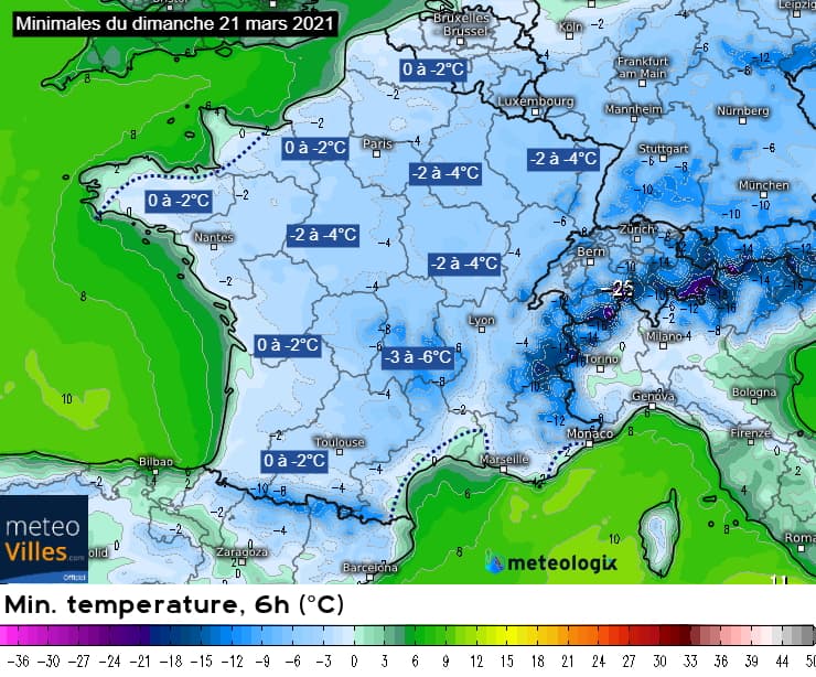 Modélisation des températures minimales pour le dimanche 21 mars 2021 - modèle CEP via meteologix