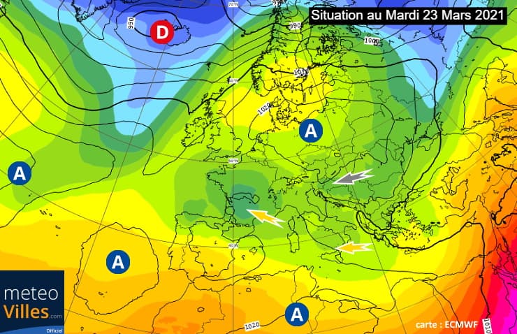 Situation à échelle continentale pour le mardi 23 mars 2021 - via ECMWF