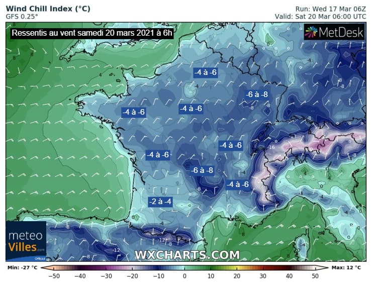 Températures ressenties au vent le samedi 20 mars 2021 en matinée - modèle GFS via wxcharts.com