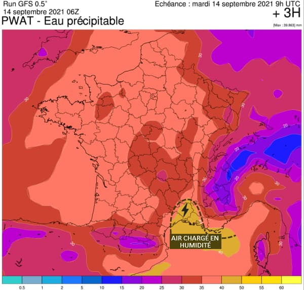 Eau précipitable dans l'atmosphère le mardi 14 septembre 2021 en matinée - via infoclimat.fr