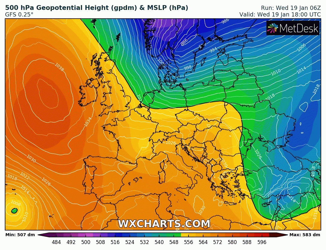 Animation des géopotentiels du 19 au janvier 2022 – Modèle GFS via WX CHARTS