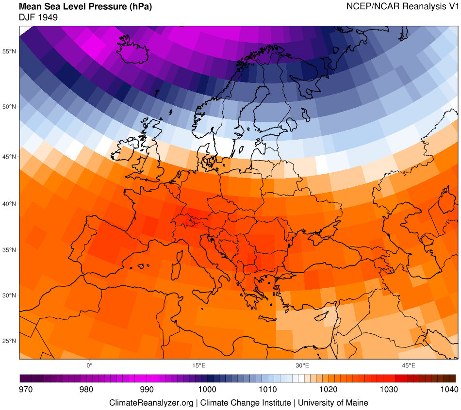 Pression atmosphérique moyenne sur l'Ouest de l'Europe durant l'hiver 1975-1976 – Climatereanalyzer