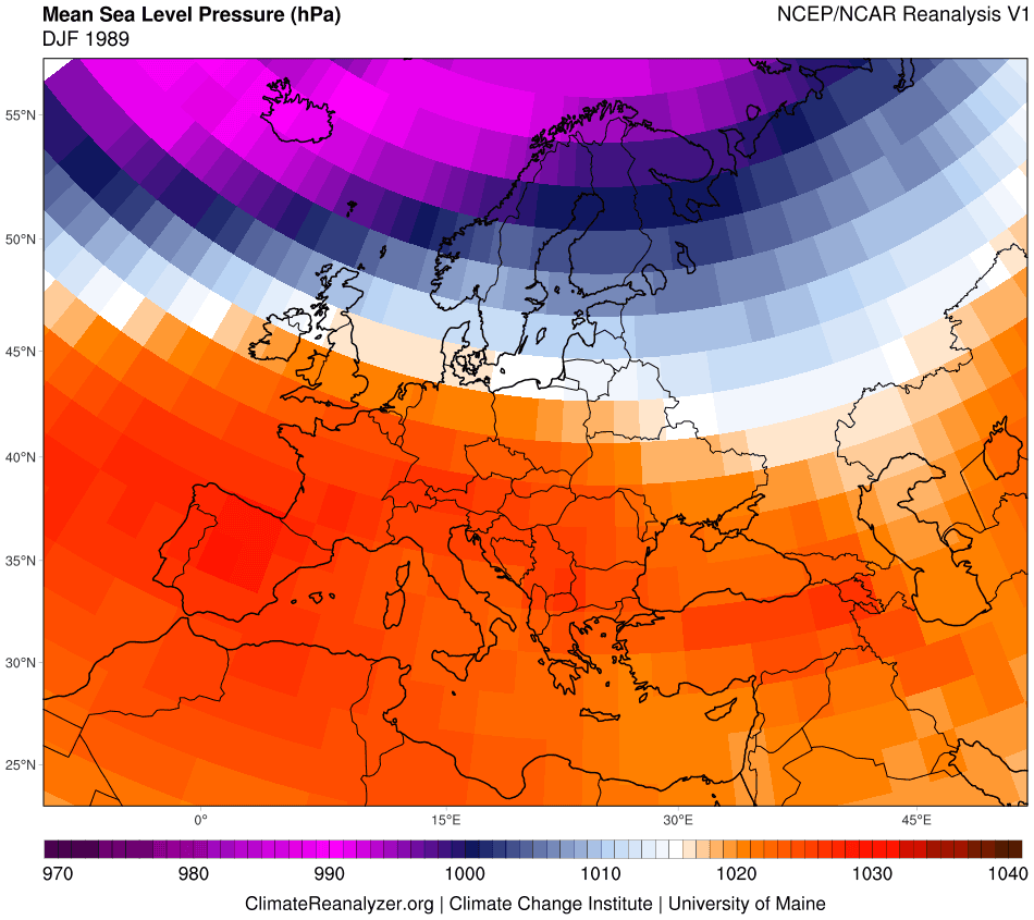 Pression atmosphérique moyenne sur l'Ouest de l'Europe durant l'hiver 1988-1989 – Climatereanalyzer