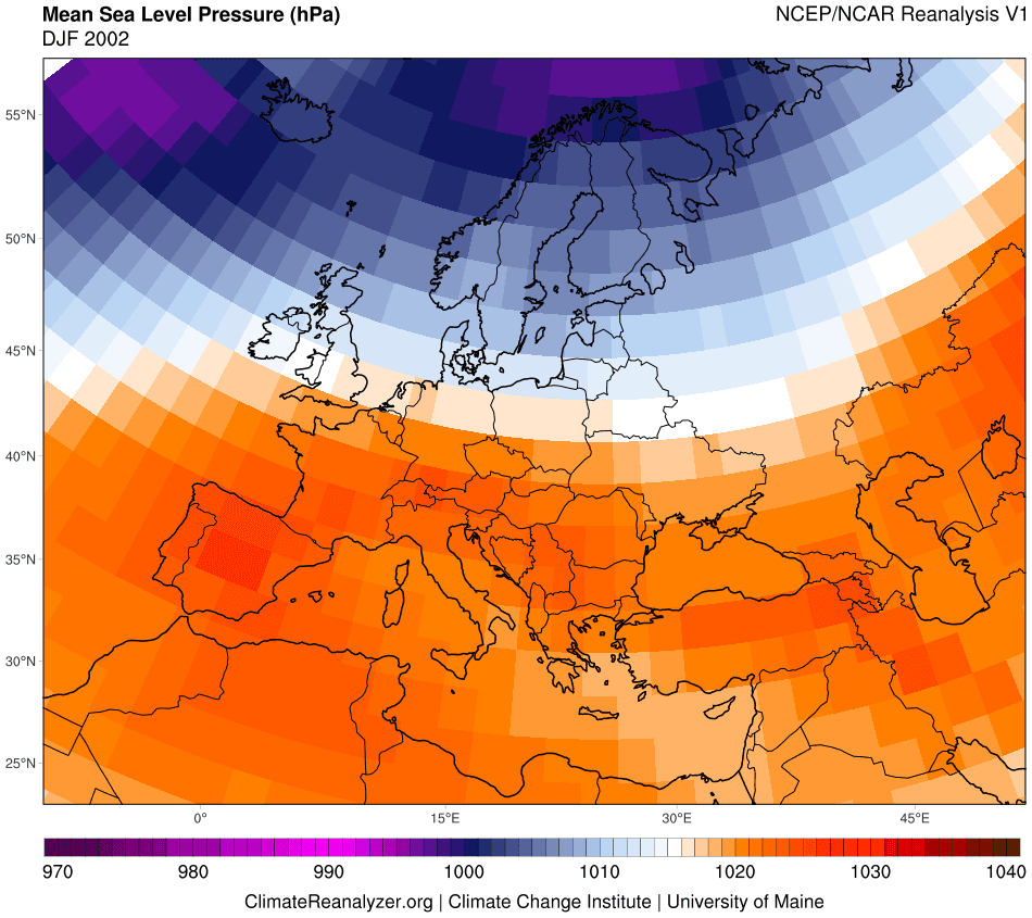 Pression atmosphérique moyenne sur l'Ouest de l'Europe durant l'hiver 2001-2002 - Climatereanalyzer