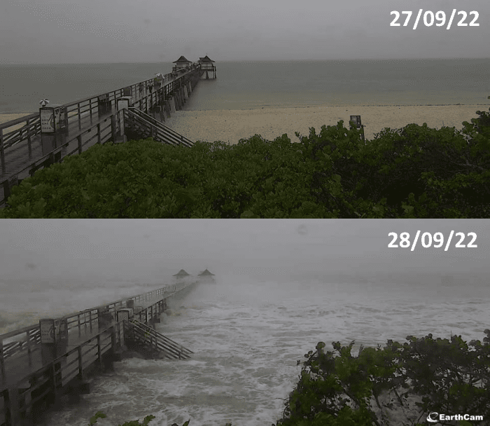 Comparaison de la jetée de Naples (Floride) entre hier et ce mercredi 28 septembre 2022 - via EarthCam