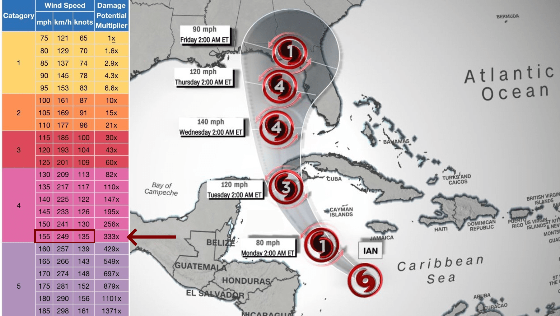 L'ouragan Ian s'est formé dans la mer des Caraïbes au début de la semaine. Il s'est nettement intensifié en atteignant Cuba, devenant à ce moment un ouragan majeur de catégorie 3. Seulement, le phénomène s'est de nouveau intensifié en quittant l'île et en poursuivant sa route au-dessus des eaux chaudes du golfe du Mexique. L'ouragan a rapidement été réévalué en catégorie 4 et a quasiment atteint la catégorie 5 ce mercredi 28 septembre 2022 au large de la Floride ! En effet, les avions de reconnaissance ont mesuré des vents moyens proches des 250 km/h, ce qui constitue la frontière entre la catégorie 4 et la catégorie 5 !