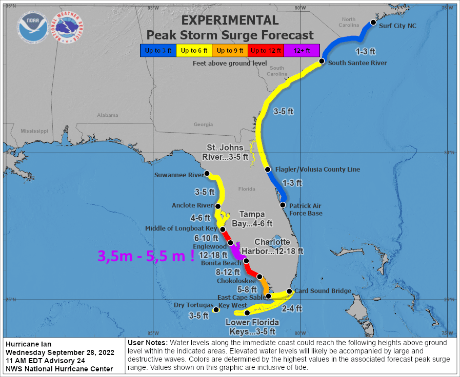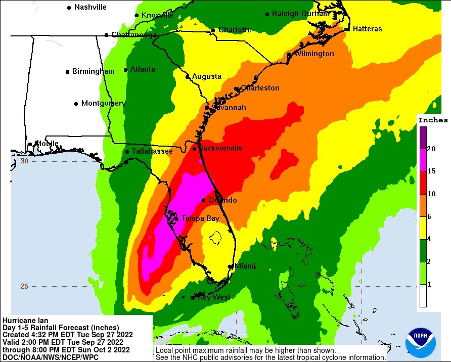Outre les vents très puissants et l'onde de tempête, on craint également des inondations majeures liées aux pluies diluviennes qui vont s'abattre sur tout le centre de la Floride. Sur les zones en rouge et violet sur la carte ci-dessous, on prévoit entre 250 et 450 mm de pluie au passage de l'ouragan Ian. De telles quantités d'eau sont susceptibles de causer d'importantes inondations sur de vastes zones, faisant entrer en crue de nombreux cours d'eau de la région.