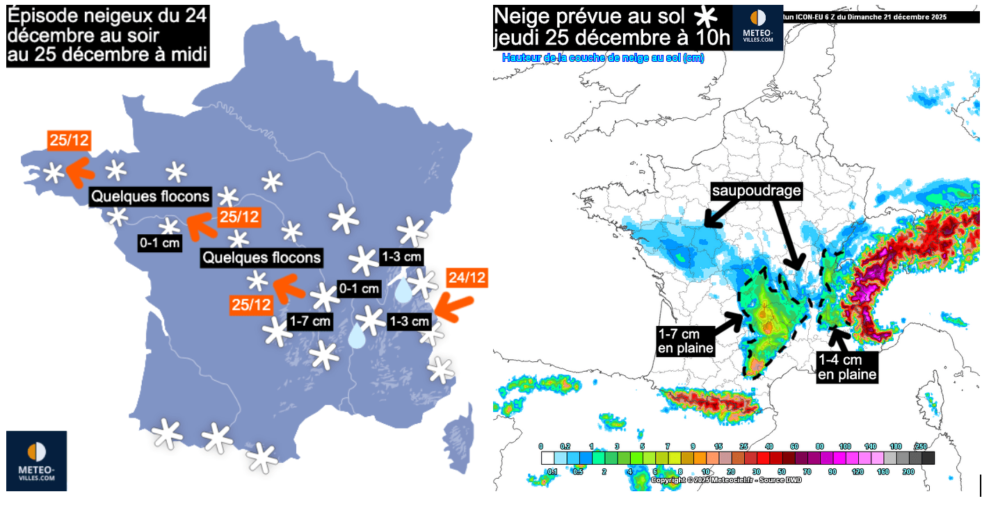 Entre le 24 décembre au soir et le 25 décembre, une petite dépression d’altitude traversera le pays, apportant des températures comprises entre -8 et -10°C à 850 hPa.  Ce creux barométrique pourrait provoquer quelques faibles chutes de neige entre la région Rhône-Alpes, la Franche-Comté, la Bourgogne, le Centre, le Massif central, les Pays de la Loire et la Bretagne avec d fermeres températures approchant 0°C l’après-midi.