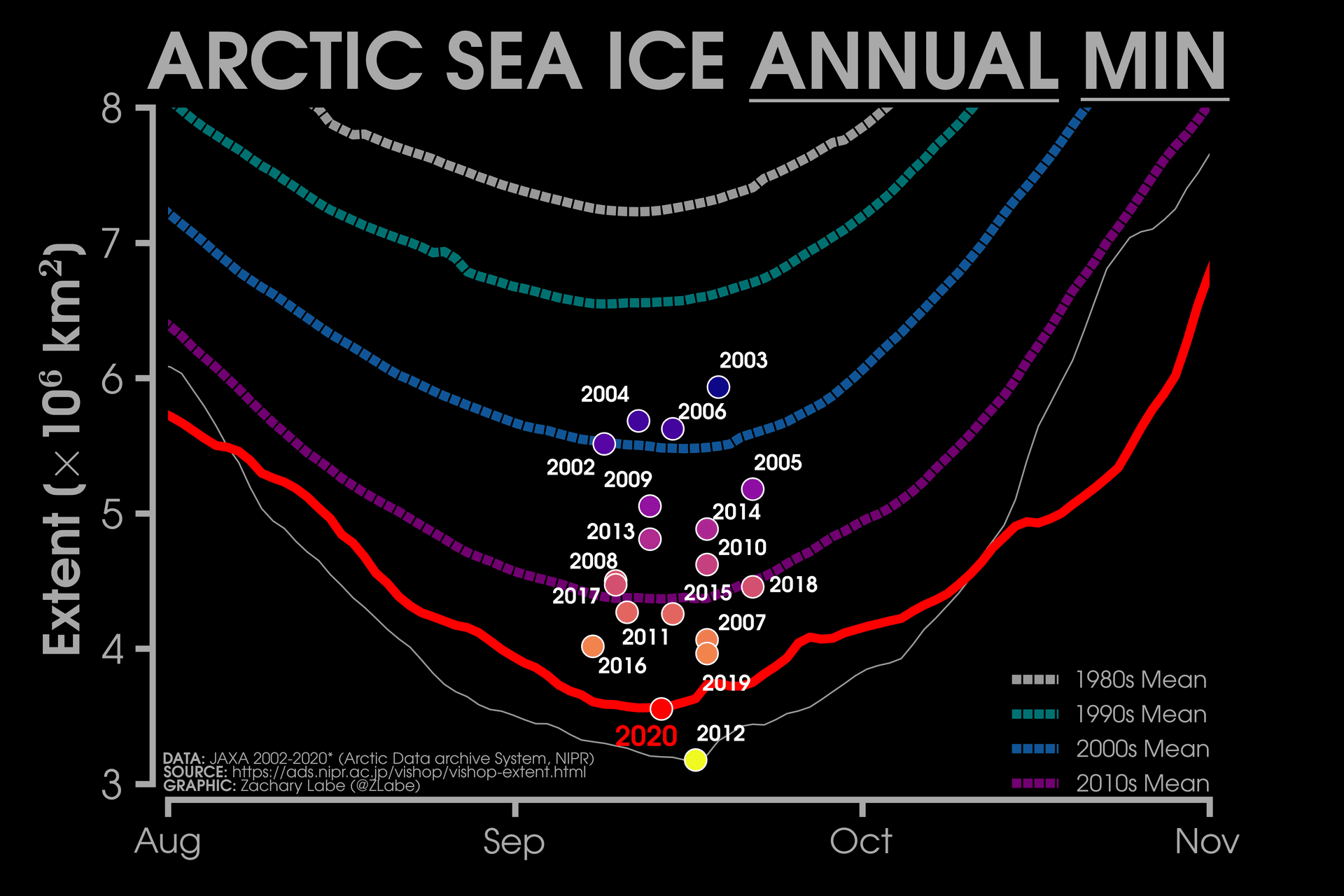 L’automne se poursuit et le cœur de la saison froide approche à grands pas sur l’Hémisphère Nord. Au-delà du cercle Arctique, ceci se répercute par une reformation progressive des glaces. Mais malheureusement, nous partons de très bas en cette année 2020 : en effet pour rappel, l’extension des glaces avait atteint 3.74 millions de km2 le 15 septembre. Il s'agissait de la 2e fois seulement où cette banquise chutait sous les 4 millions de km2 depuis le début des analyses satellitaires, juste derrière le record de l’été 2012.