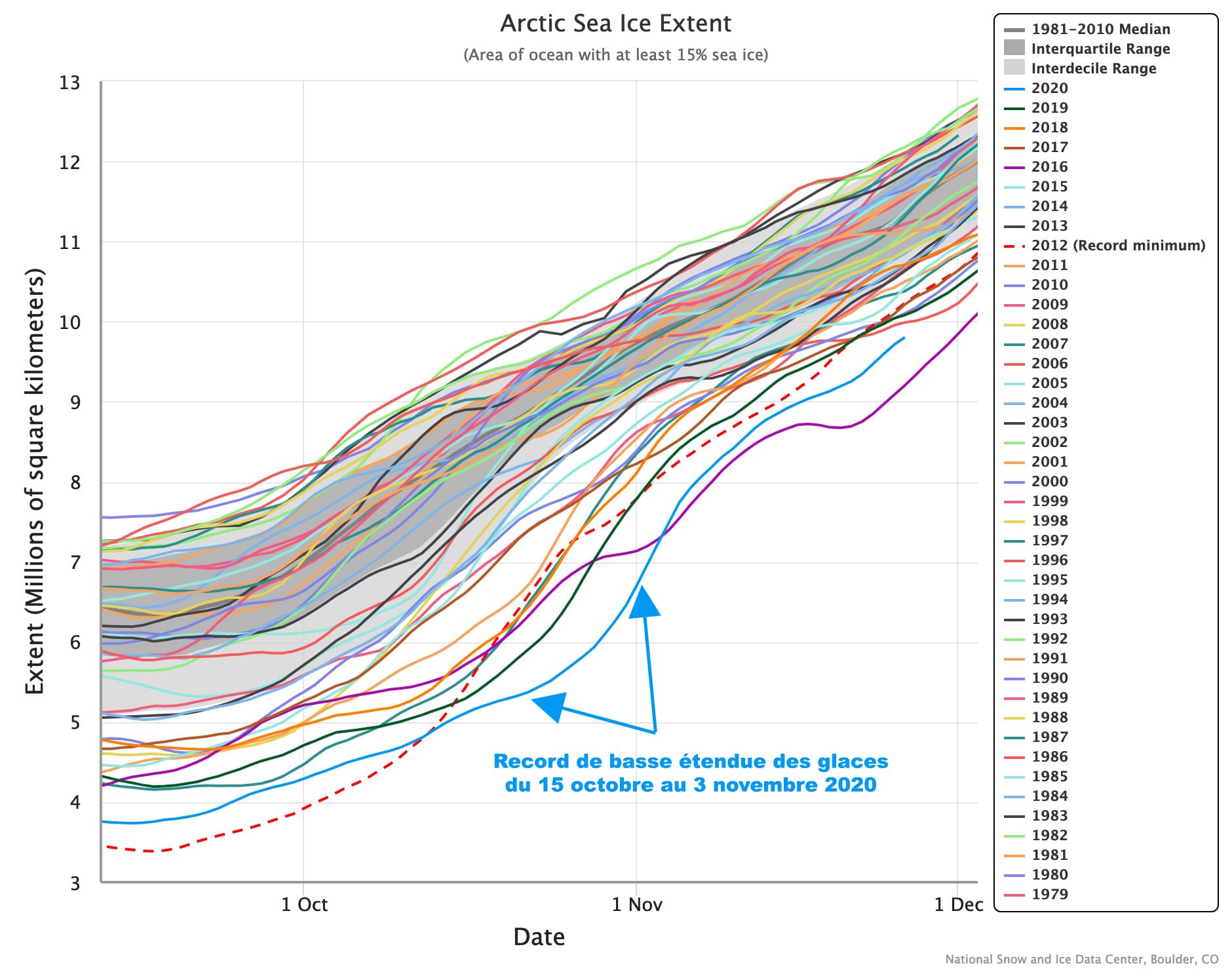 Avec une étendue moyenne estimée à 5.28 millions de km2, il s’agissait de la pire statistique pour un mois d’octobre depuis le début de ces mesures en 1979.  Selon le « National Snow and Ice Data Center », centre américain de référence dans la recherche polaire, des records ont même été battus quotidiennement du 15 octobre au 3 novembre, en dessous des niveaux de 2019 ou 2016.