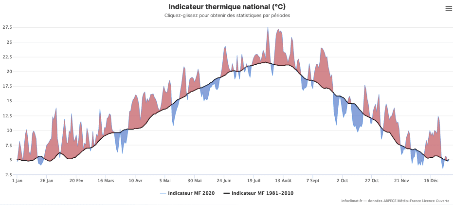 Nous l'avions annoncé dès la mi-décembre, et confirmé il y a quelques jours (>>) : 2020 a battu un record, devenant l'année la plus chaude jamais observée en France. La température moyenne a atteint 14.07°C (jamais le seuil des 14°C n'avait été dépassé), devançant l'année 2018 (13.94°C) et 2014 (13.75°C).