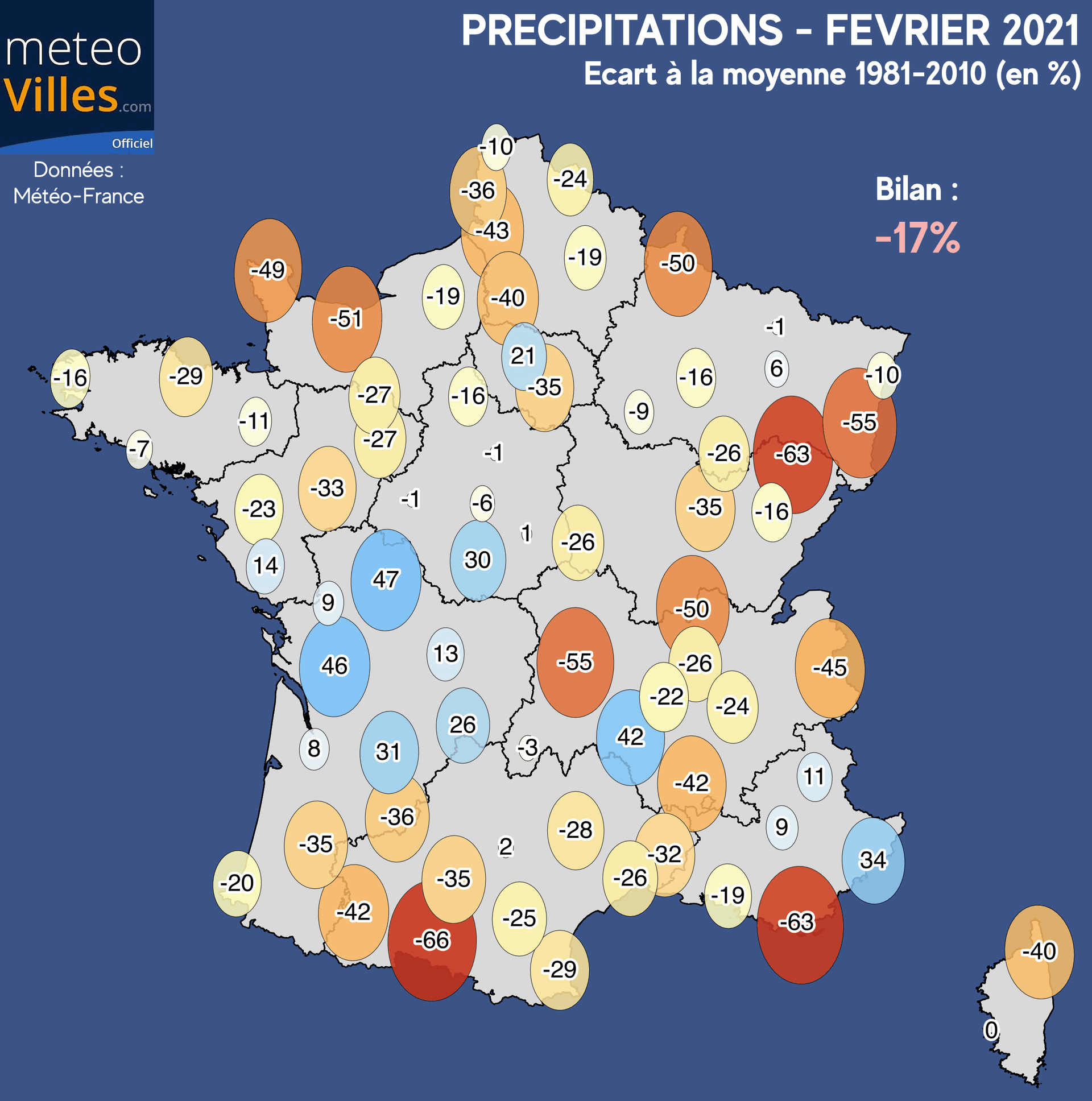 Avec cette longue période sèche lors de la 2e partie du mois, ce mois de février a donc été globalement déficitaire, avec un bilan de -17% à l'échelle national sur notre panel de stations.