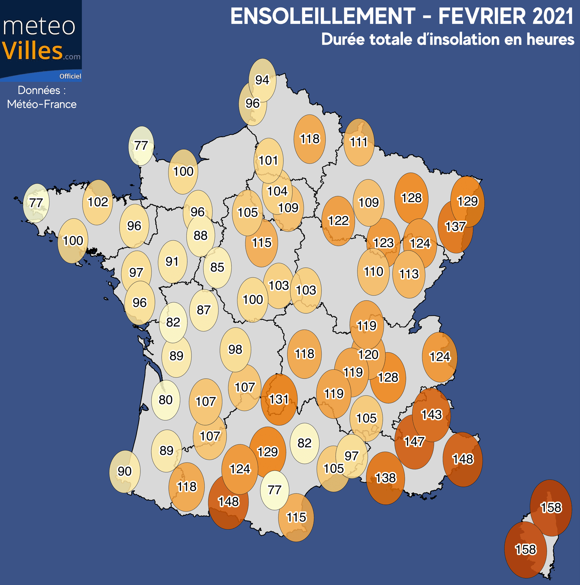 Nous pouvons toutefois remarquer un certain dégradé Est-Ouest : c'est à l'Ouest où le soleil s'est montré le plus discret avec mois de 100h cumulés : nous chutons jusqu'à 80h à Bordeaux, et un minimum de 77 heures à Cherbourg, Brest ainsi qu'à Carcassonne.