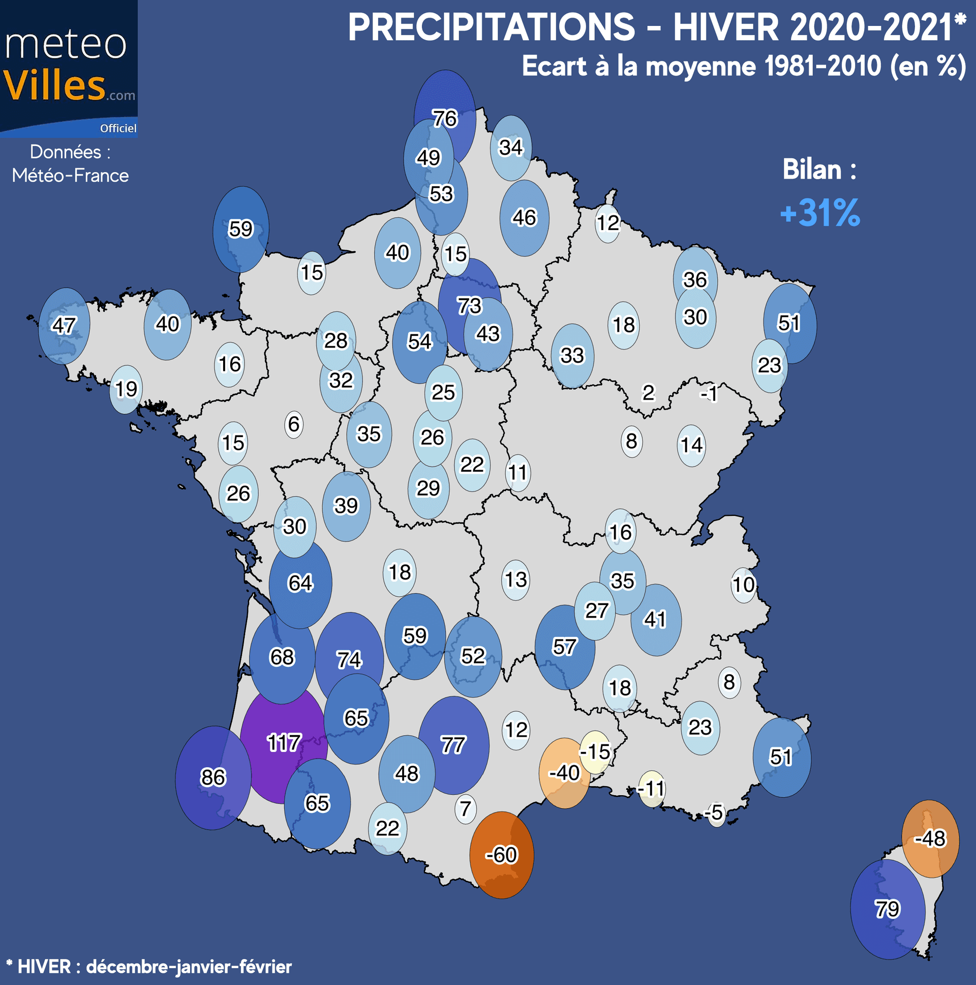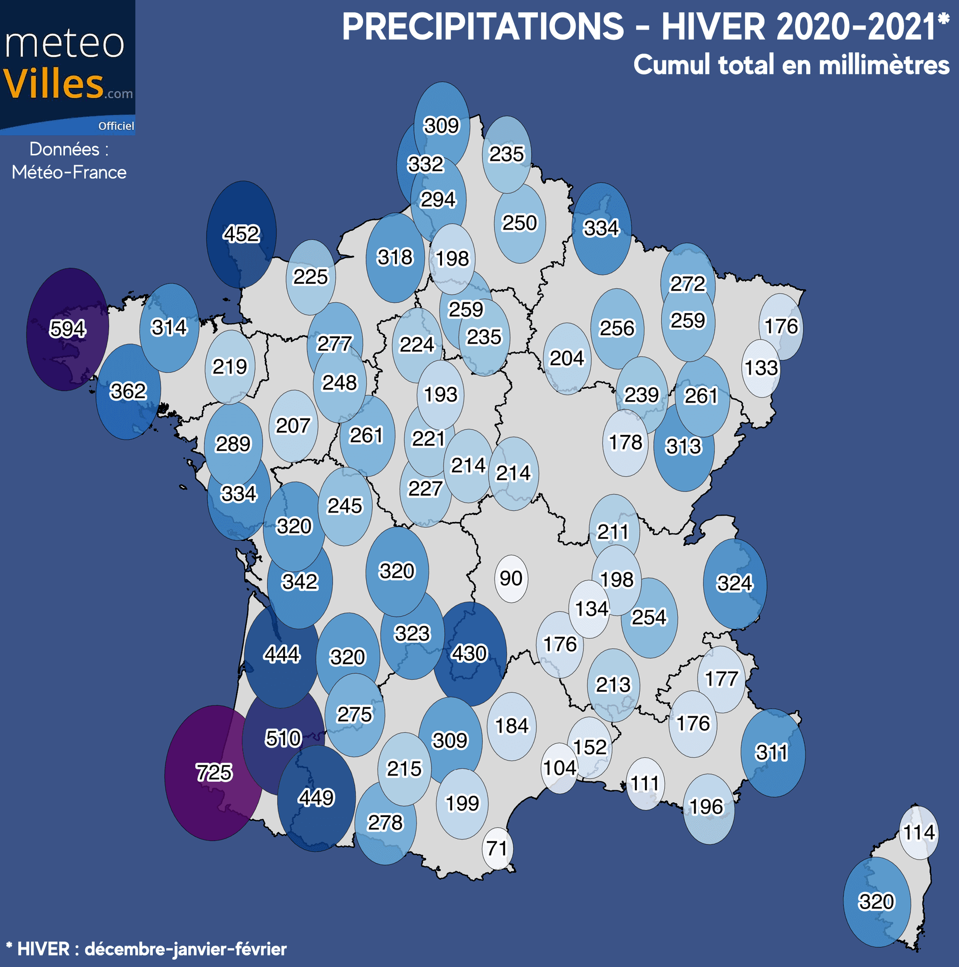 Traduite en termes de cumul pluviométrique, très rares sont les villes a ne pas avoir dépassé la barre des 150mm durant ces trois mois d'hiver (71mm à Perpignan, 90mm à Clermont-Ferrand, 104mm à Montpellier, 111mm à Marignane, 114mm à Bastia, 133mm à Colmar, 134mm à St-Etienne).