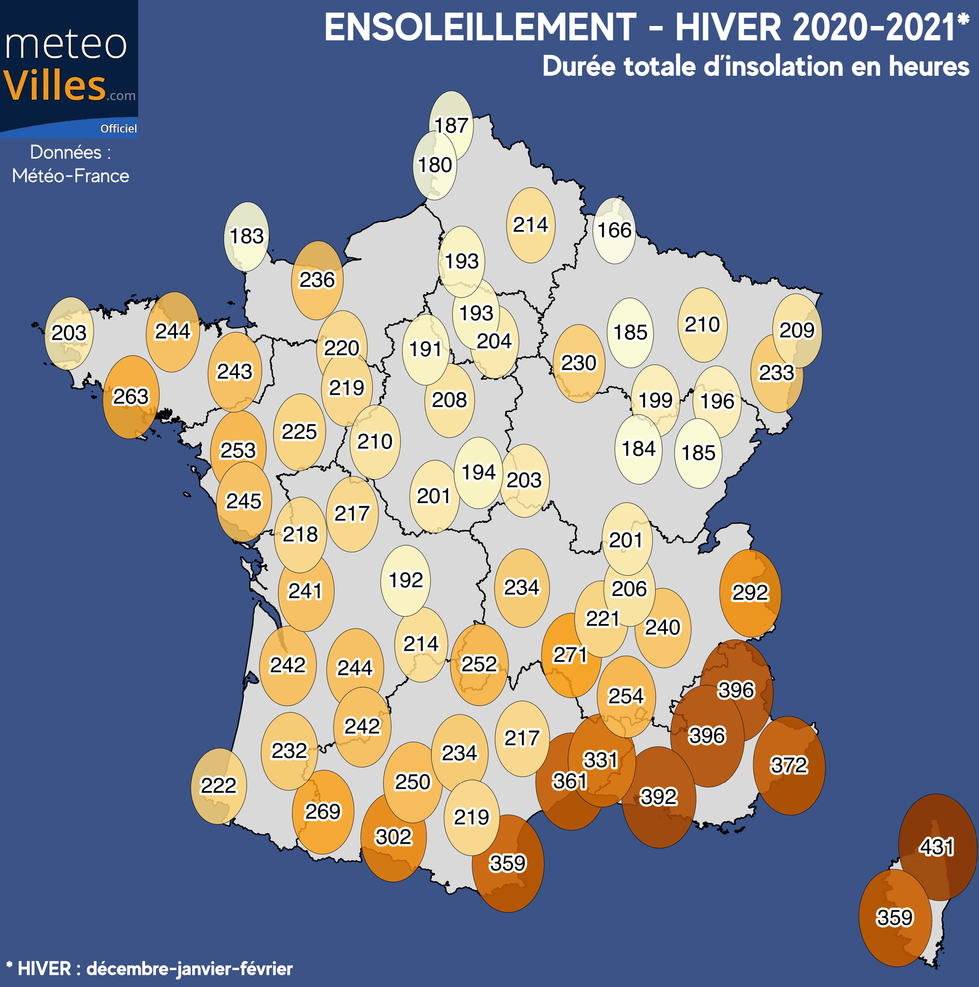 Si le déficit est marqué au Sud, les régions bordant la Méditerranée ont tout de même une large avance en terme de durée totale d'insolation : hormis les 302h observés à Saint-Girons, toutes les villes ayant cumulé plus de 300h de soleil se situe près de la grande bleue. Certaines stations ont d'ailleurs approché, voire dépassé les 400h au total (392h à Marseille-Marignane, 396h à Embrun et Saint-Auban et un maximum de 431h à Ajaccio).