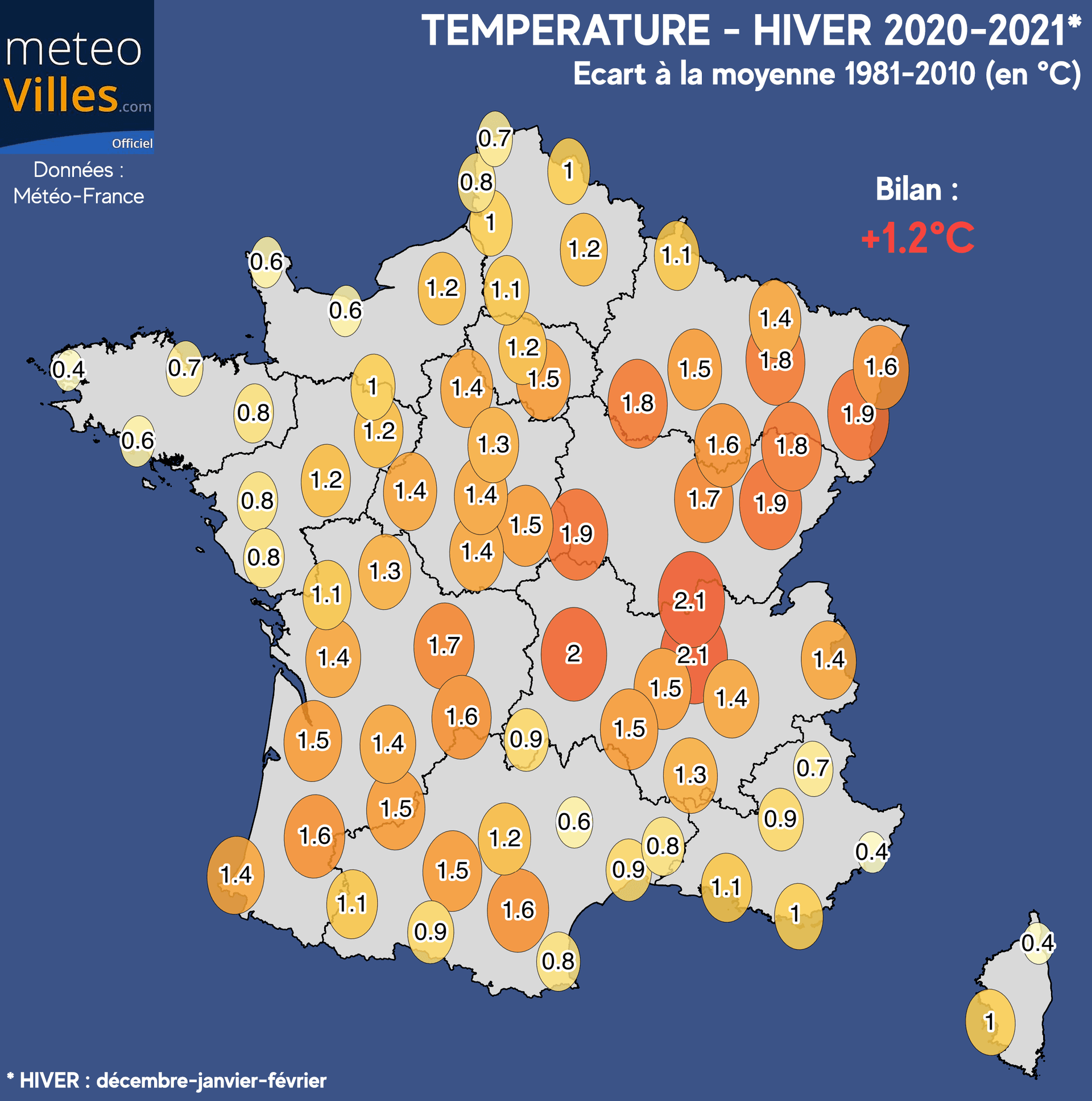 Malgré cette alternance, c'est donc bel et bien la douceur qui la largement pesé dans la balance. En effet, le bilan thermique national s'élève à +1.2°C sur cet hiver 2020-2021 par rapport à la moyenne 1981-2010.