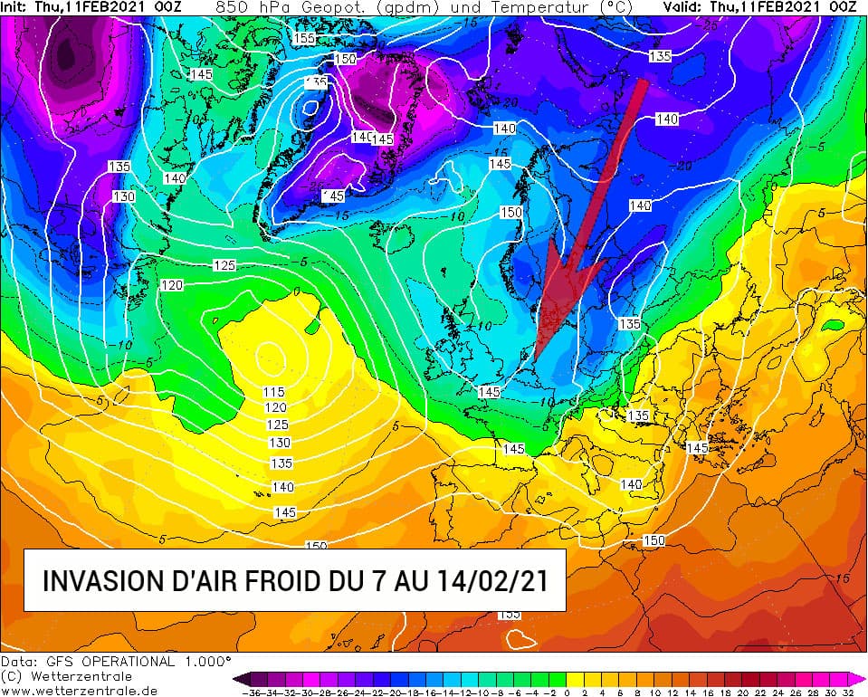 Températures à 850 hPa par le modèle GFS, en date du 11 février 2021
