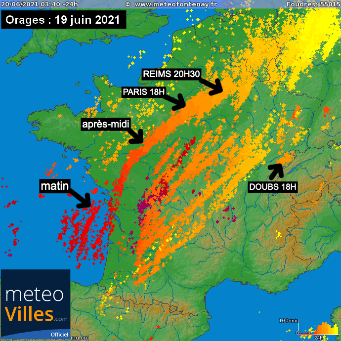 Au final, plus de 43 000 éclairs ont été relevés durant cette seule journée du 19 juin 2021, ce qui en fit la journée la plus orageuse de l'année en France. Le tracé des orages les plus violents fut visible sur la carte comptabilisant tous les éclairs de la journée, notamment le système orageux ayant donné plusieurs tornades et engendré de nombreux dégâts entre les pays de la Loire et la Belgique.