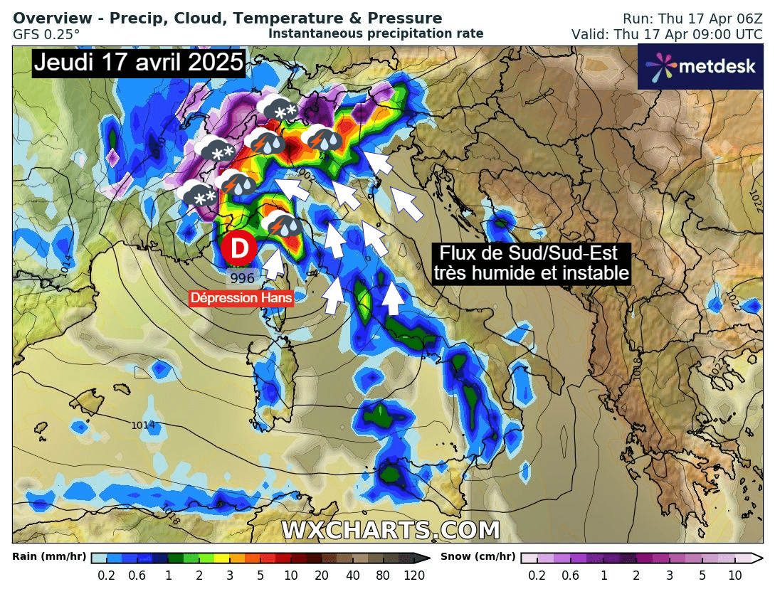 Sous l'influence de la dépression Hans s'étant isolée en milieu de semaine du côté de la Méditerranée, les régions alpines entre le Nord-Ouest de l'Italie et le Sud de la Suisse ont été concernées par un épisode pluvio-orageux exceptionnel entre le 16 et le 17 avril 2025.