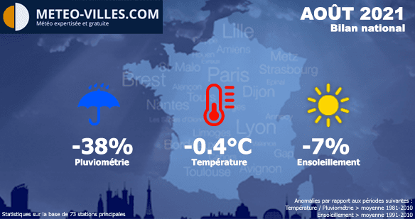 Comme à chaque début de mois, nous vous proposons un bilan climatologique du mois écoulé. Place donc au bilan cartographié du mois de AOÛT 2021 en termes de température, pluviométrie et ensoleillement sur un panel de 73 stations*.