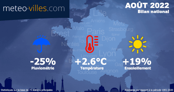 Comme à chaque début de mois, nous vous proposons un bilan climatologique du mois écoulé. Place donc au bilan cartographié du mois d'AOÛT 2022 en termes de température, pluviométrie et ensoleillement sur un panel de 73 stations*.