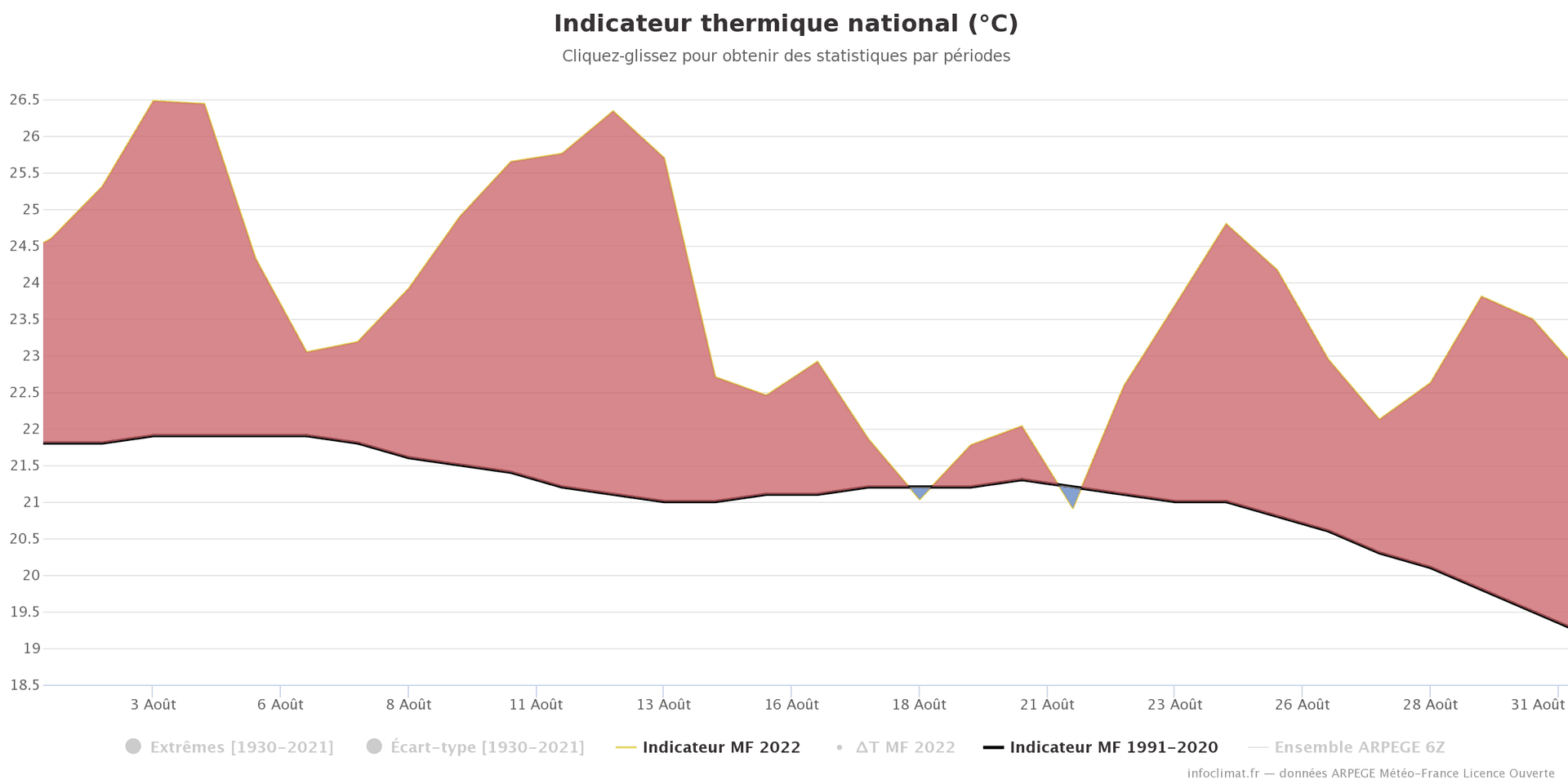 Ce mois d'août a poursuivi une série de mois particulièrement chauds. Au final, l'indicateur thermique national (basé sur les relevés de températures minimales et maximales de 30 stations métropolitaines) s'est élevé à 23.68°C soit une anomalie thermique portée à +2.6°C sur ce mois d'août 2022. Il s'agit tout simplement du 2e mois d'août le plus chaud jamais mesuré en France, juste derrière l'historique mois d'août 2003 (indicateur de 24.88°C soit +3.8°C d'anomalie).