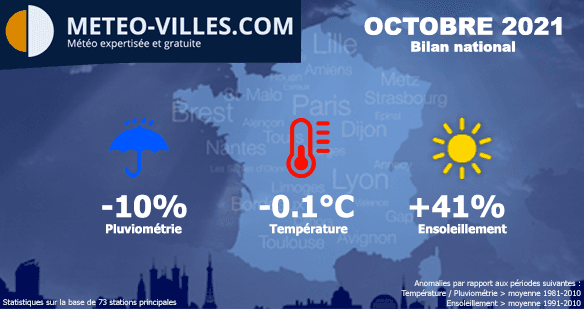 Comme à chaque début de mois, nous vous proposons un bilan climatologique du mois écoulé. Place donc au bilan cartographié du mois d'OCTOBRE 2021 en termes de température, pluviométrie et ensoleillement sur un panel de 73 stations*.