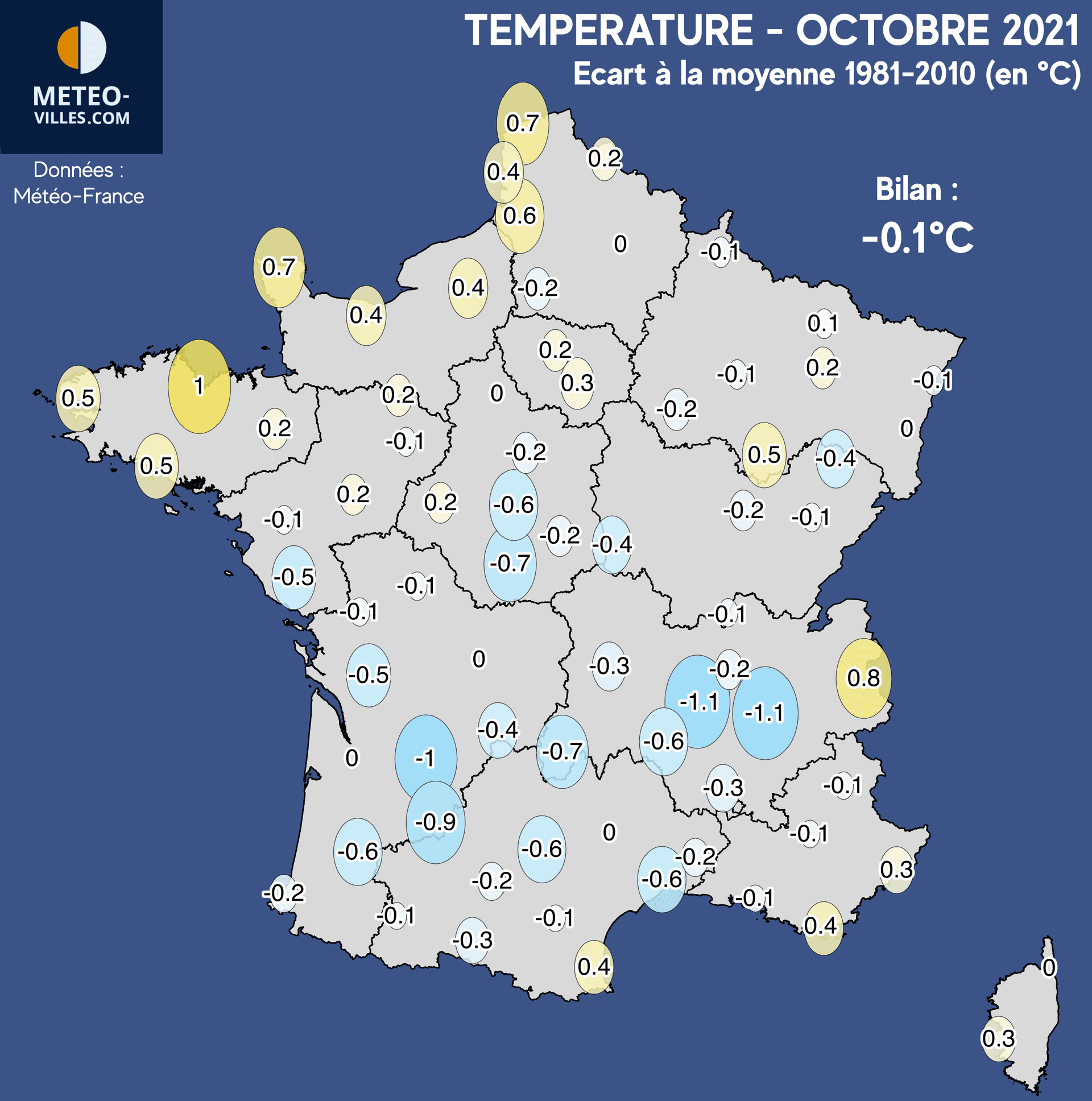 Au final, avec un indicateur thermique national de 13.4°C, ce mois d’octobre 2021 a été peu ou prou dans les moyennes de saison puisque l’anomalie est quasiment neutre (-0.1°C par rapport aux moyennes 1981-2010).