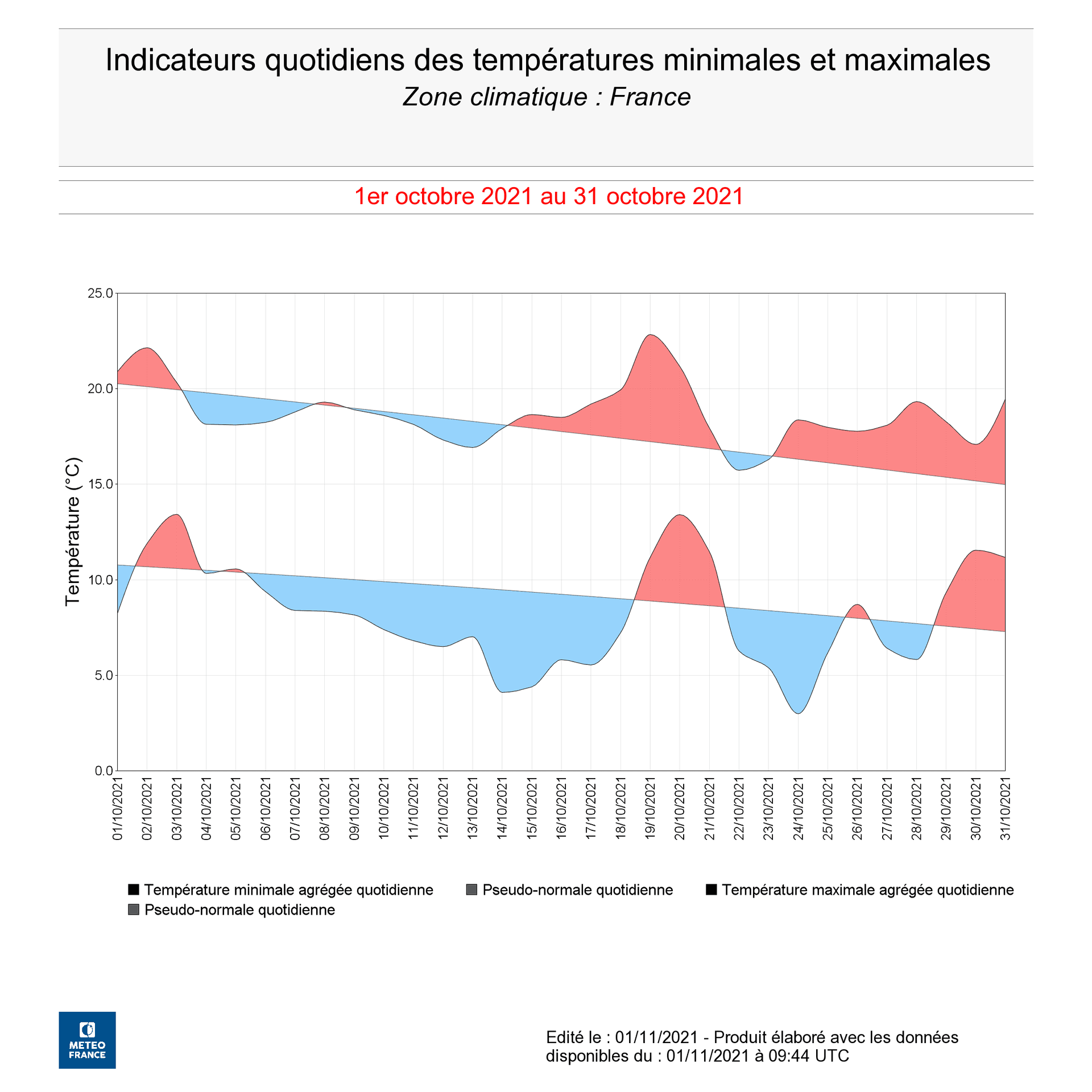 Températures minimales et maximales en France en octobre 2021 - écart à la moyenne 1981-2010 - Twitter Gaetan Heymes / Météo-France