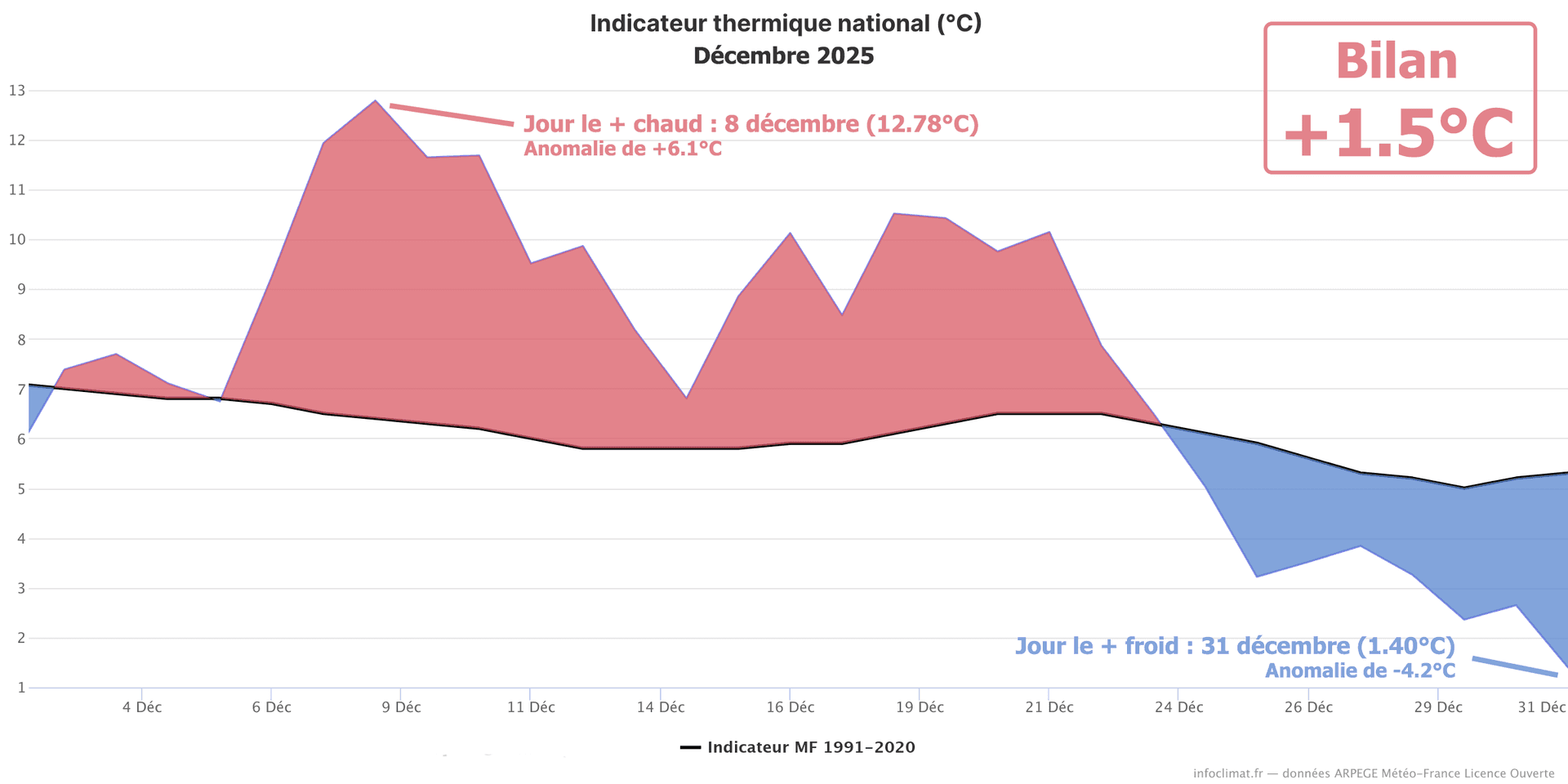Indicateur thermique national pour décembre 2025 depuis l'après-guerre (1946) - Infoclimat