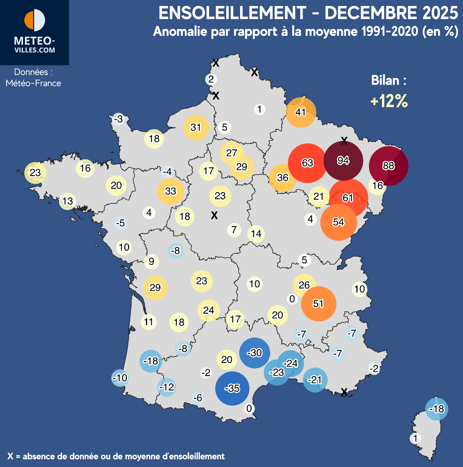 Terminons sur l'ensoleillement, avec un mois de décembre 2025 dans l'ensemble lumineux puisque le bilan de notre panel affiche un léger excédent de +12%. Mais tout comme pour la pluviométrie, ceci cache des disparités plus importantes.