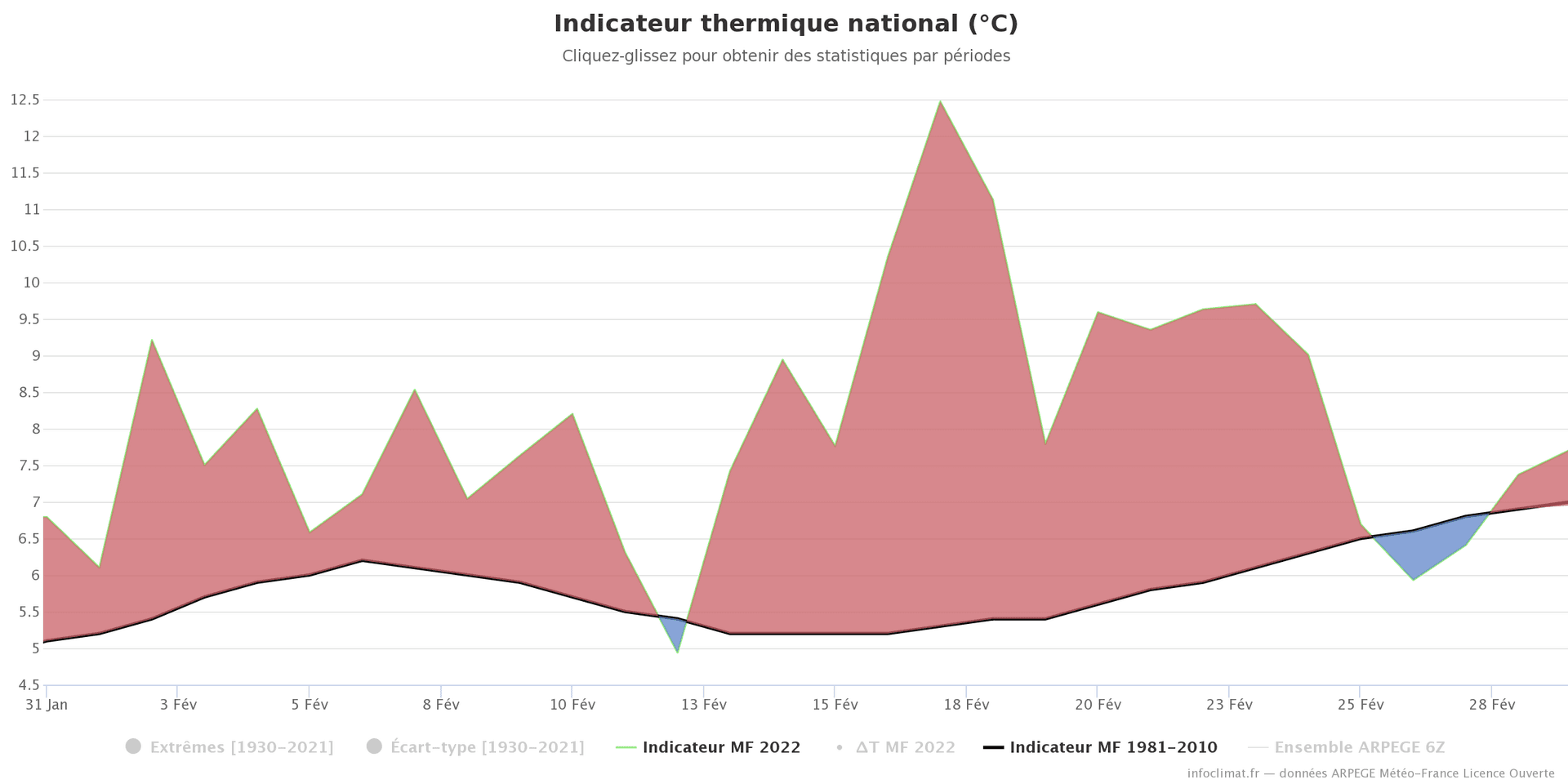 Avec une indicateur thermique national de 8.1°C, ce mois de février a été particulièrement doux : l'anomalie mensuelle s'élève à +2.3°C par rapport à la moyenne de la période 1981-2010. Un mois qui n'est toutefois pas dans le top 10 des plus doux observés dans le pays.