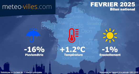 Comme à chaque début de mois, nous vous proposons un nouveau bilan climatologique. Place désormais au bilan cartographié de FEVRIER 2025 en termes de température, pluviométrie et ensoleillement sur un panel de 73 stations*. Les anomalies présentées sont calculées à partir des moyennes climatiques de la période de référence 1991-2020 sur l'ensemble des stations du panel.