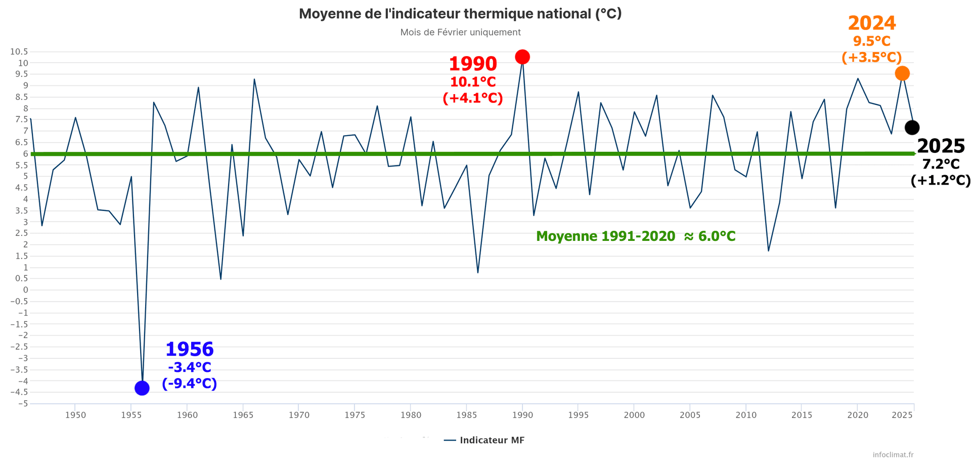 Indicateur thermique national pour février 2025 depuis l'après-guerre (1946) - Infoclimat