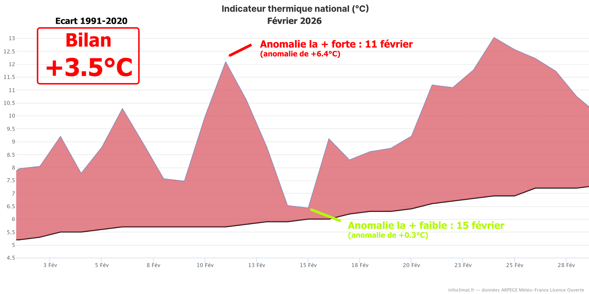 Avec un indicateur thermique national de 9.60°C, ce mois de février 2026 a été marqué par une douceur incroyable. En effet, il s'agit d'une anomalie exceptionnelle de +3.50°C par rapport à la moyenne 1991-2020 ! Février 2026 se place dès lors au second rang des plus doux mesurés en France, juste derrière le record de février 1990 (anomalie de +3.99°C), et devançant de peu février 2024 (+3.45°C).